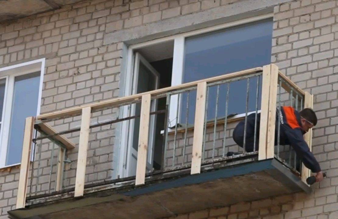 - Если ограждение значительно задвинуто внутрь балкона, то под рейки нужно подложить деревянный брусок.