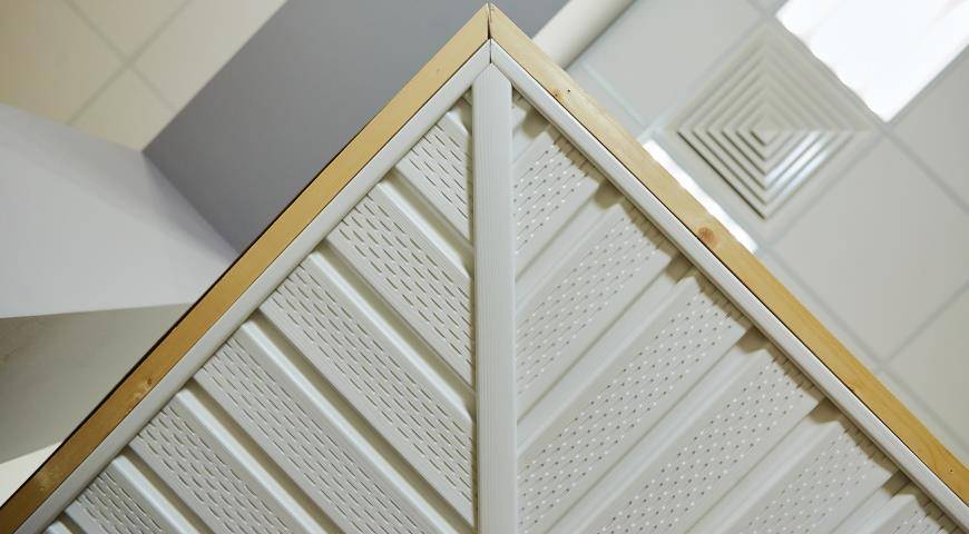 На стыках панелей для обхода углов используется либо Н-профиль, либо два J-профиля. Так, в диагональном варианте применяется J-профиль, а сами панели софитов обрезают, чтобы углы подходили друг другу.