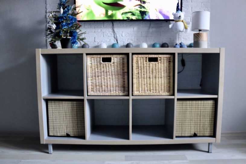 Один из самых простых и быстрых вариантов для изменения стеллажа Каллакс является его перекрашивание в другой цвет. Хорошего эффекта можно добиться оформлением одного ряда полок в отличающийся тон.