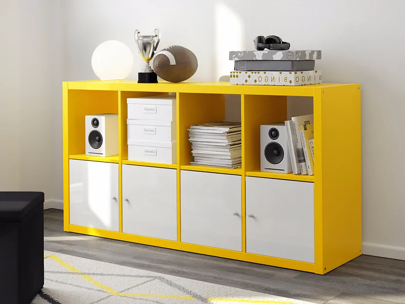 Продукция этой линейки в Икеа довольно разнообразна. От небольших четырехсекционных конструкций до массивных стеллажей на 16 ячеек. И из них можно создать целый ряд универсальных систем для хранения всего необходимого в гостиной или спальне.