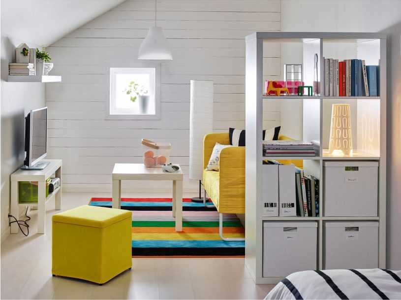 Полки устанавливаются вдоль стены или разделяют комнату на две части прямо посередине. Кроме того, основная функциональная роль такой мебели — хранение. Поэтому стоит установить в ячейках дверцы, корзины, картонные коробки, обтянутые светлой или темной тканью.