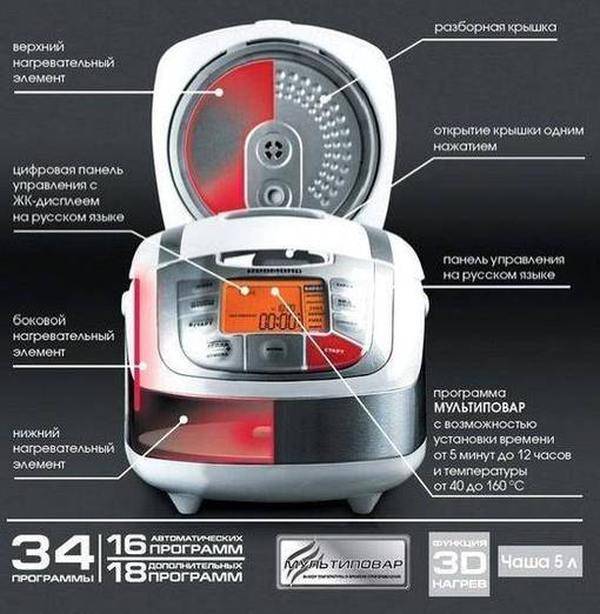 Техника работает за счет многих функций, создана для приготовления различных блюд. На ней можно жарить, тушить, выпекать или готовить овощи на пару. Она вмещает в себя 5 литров, имеет антипригарное покрытие, плотную крышку, которая позволяет сохранять горячий пар после приготовления на несколько часов. Работает на 20 режимах, есть функция «Мультиповар». Функция отложение старта позволяет включать процесс приготовления через 24 часа, выбирая подходящий режим. Мощность модели составляет 900 Вт, отсутствует функция 3D нагрева.