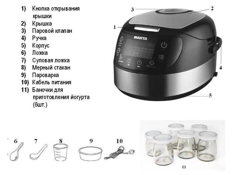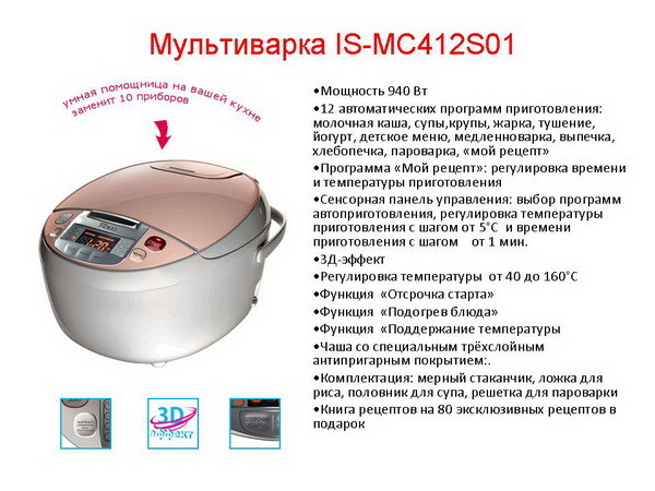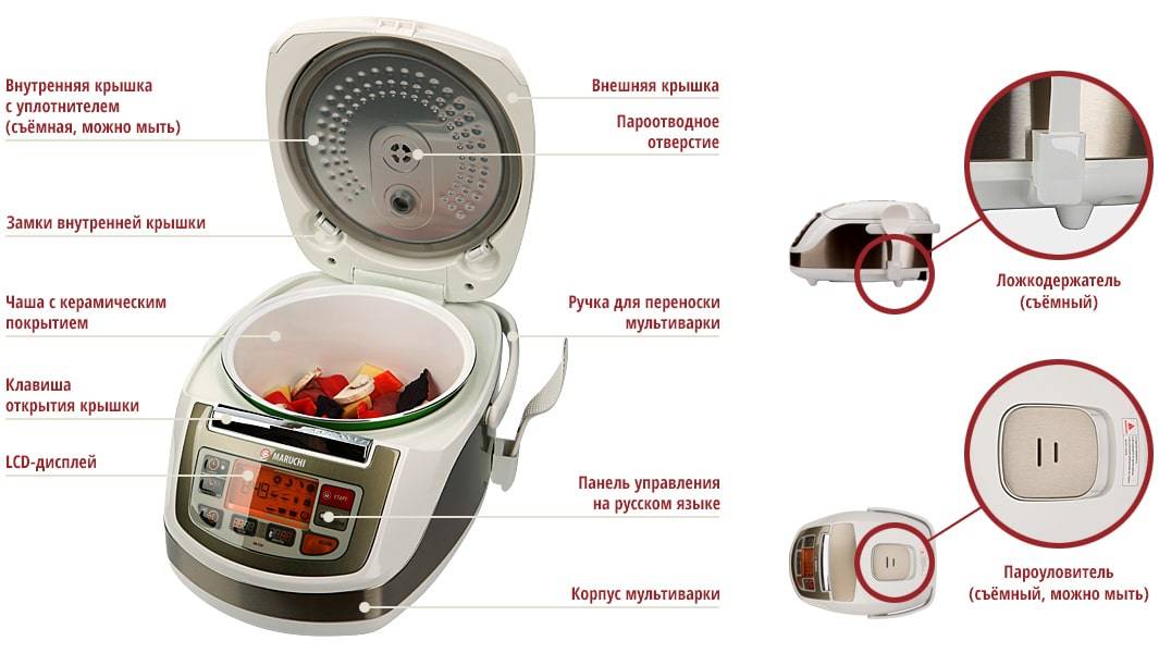 Блюда готовятся в чаше с керамическим или тефлоновым покрытием. Мультиварка дополнительно комплектуется емкостью с отверстиями для приготовления блюд на пару, лопаткой для перемешивания, мерным стаканчиком и прочими аксессуарами.