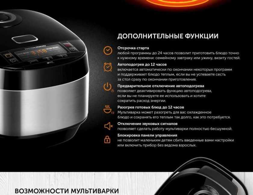 Дополнительные функции призваны еще больше облегчить работу с техникой. Это опции «отложенного старта» или «разогрева». Когда электроприбор начнет готовить, продукты даже не нужно перемешивать – конструкция продумана таким образом, чтобы полностью автоматизировать готовку.