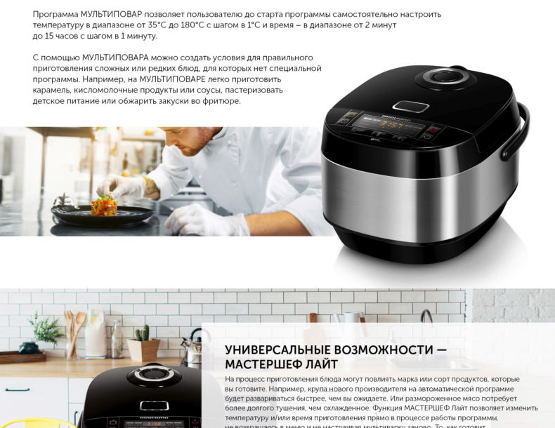 Устройство распространяет тепло равномерно, поэтому блюда получаются полностью приготовленными. Оптимальный нагрев осуществляется за счет особой конструкции чаши, представляющей собой сферу. Она изготовлена из тефлона толщиной в 2,5 мм. 57 программ и 300 режимов приготовления позволяет ежедневно радовать семью вкусными блюдами. Среди необычных режимов выделяются программы для приготовления соусов, запеканок, варенья, глинтвейна, холодца, бобов и су-вид.