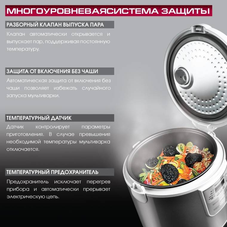 Прибор работает в автоматическом режиме, что экономит время хозяйки, которая может не контролировать процесс. К тому же он является полностью безопасным, поскольку происходит практически без вмешательства человека. После приготовления пища еще длительное время будет теплой, благодаря теплоизоляционным свойствам наружных стенок чаши.