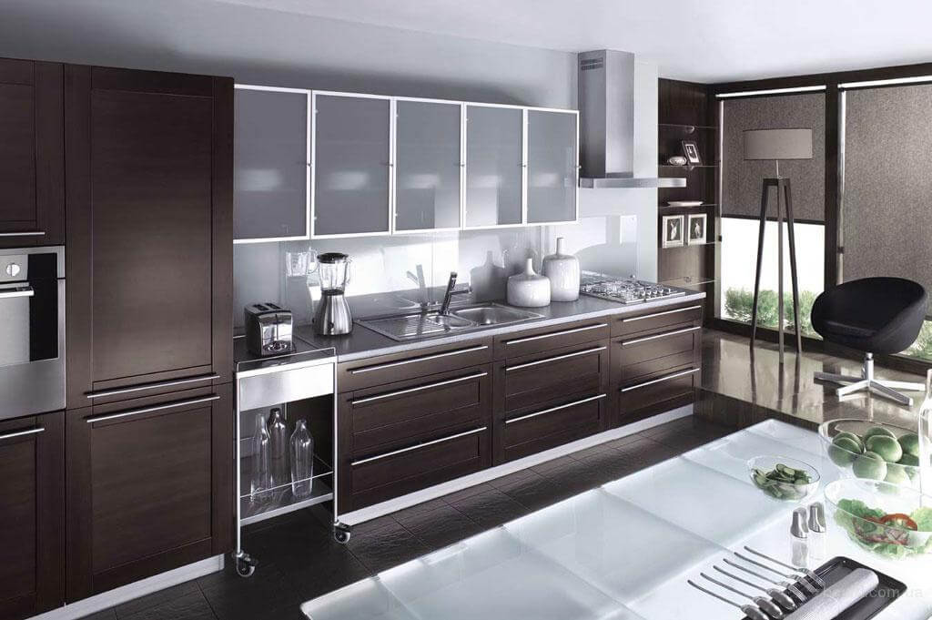 Как выбрать кухню на заказ — необычную и экстравагантную? Здесь стоит обратить внимание на фасады из металла или стекла. Для определенных дизайнерских решений такие варианты вполне приемлемы и широко применимы. Необходимо учесть, что уход за такой кухней должен быть тщательным, а эксплуатация — бережной