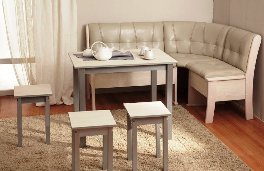 - Этот предмет интерьера представляет собой угловой диван и обеденный стол. Их можно легко перестанавливать в иное место по желанию обладателей;