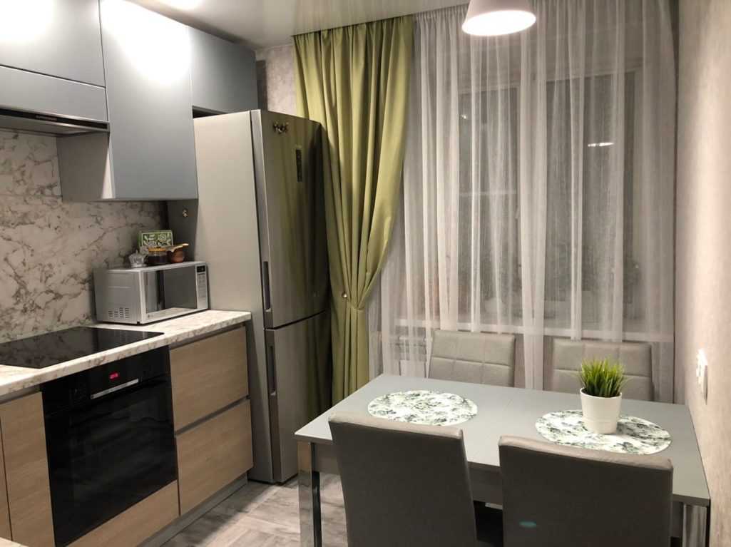 - Нет навесных шкафов из МДФ. 4 отсека с одинарными дверцами цвета мокрого камня, покрытые верхом из массивного ЛДСП, напоминающего свежий срез дуба. Ручки выполнены в тех же цветах, что и нижние шкафы. Стены облицованы плиткой, напоминающей белый кирпич, с такими же чистыми белыми швами. Квадратный стол — брат-близнец столешницы из аналогичного материала с серыми хромированными ножками, нагруженными угловой геометрией. Кресла обиты льняной тканью мышиного цвета с черной хромированной опорой. На окнах ставни-трансформеры со вставками из золотистых капроновых лент. Потолок оформлен рассеянным точечным светом.