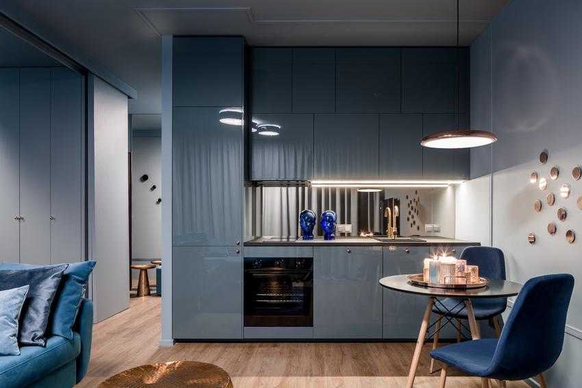 - Верхняя часть состоит из 2-х полок по всей длине кухни небесного цвета. Нижнюю часть можно дополнить 3-4 шкафчиками, покрытыми глянцевой фольгой, напоминающей цвет молочного какао. Конструкция фурнитуры для ручек проста — идеально ровная форма. Стол изготовлен из прочного закаленного стекла в оттенке синего флакона. Стулья на тонких хромированных ножках. Шторы из голубой или белой органзы продолжают линию стены. В глянцевом натяжном потолке — две люстры, похожие на выжженные на солнце ульи.