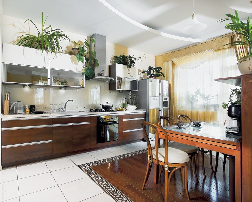 - Возможно расположение цветов на полу, если размеры кухни позволяют это сделать.