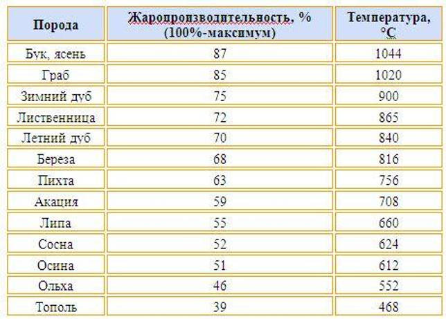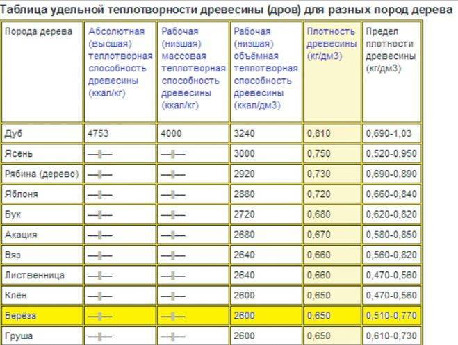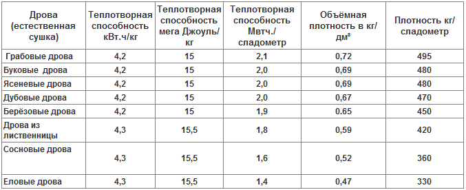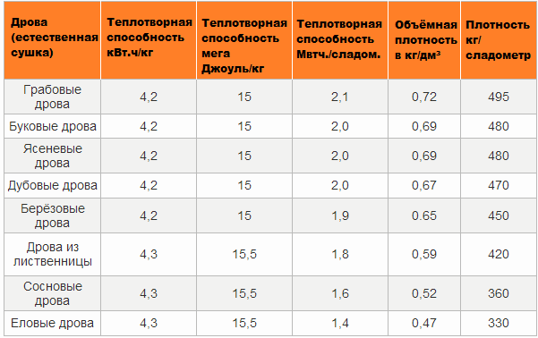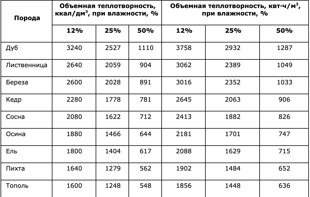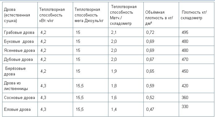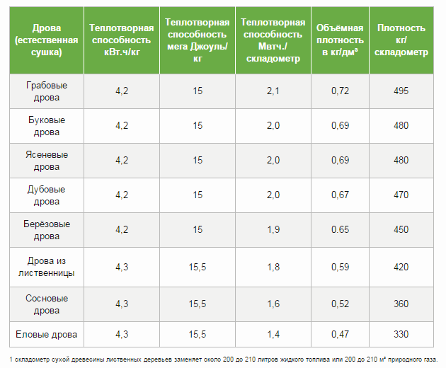 Разные виды топлива имеют различную теплотворность. Например, 1 м³ дров березы равен 1,1 м³ ольховых, 1,5 м³ осиновых, 1,2 м³ сосновых, 1,3 м³ еловых, 0,75 м³ дубовых.