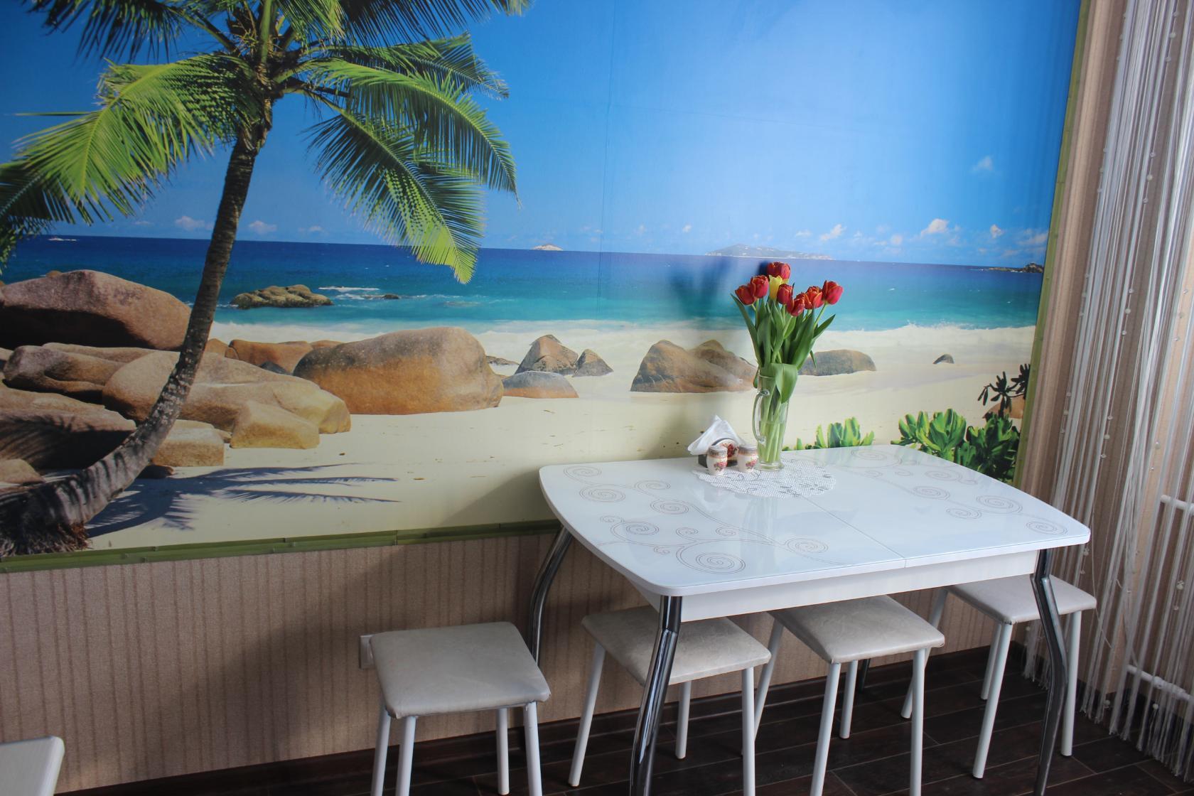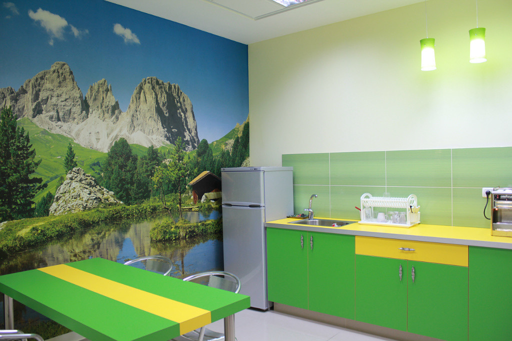 - Возле кухонного уголка. Спокойный цветовой фон сделает эту область зоной отдыха после приема пищи. И кроме природных пейзажей, сюда подойдут изображения знаменитостей или рисунки с 3D эффектом.