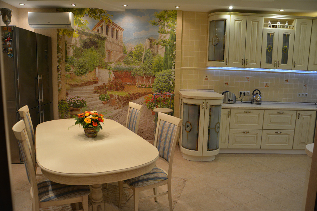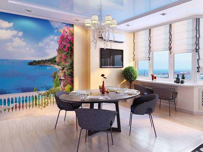 Зрительно увеличить комнату помогут фотообои, на которых изображено продолжение помещения. Это может быть широкий балкон, терраса или длинный коридор, распахнутое окно с видом на море, и так далее. В таком случае кухня сразу же приобретает более широкие границы.