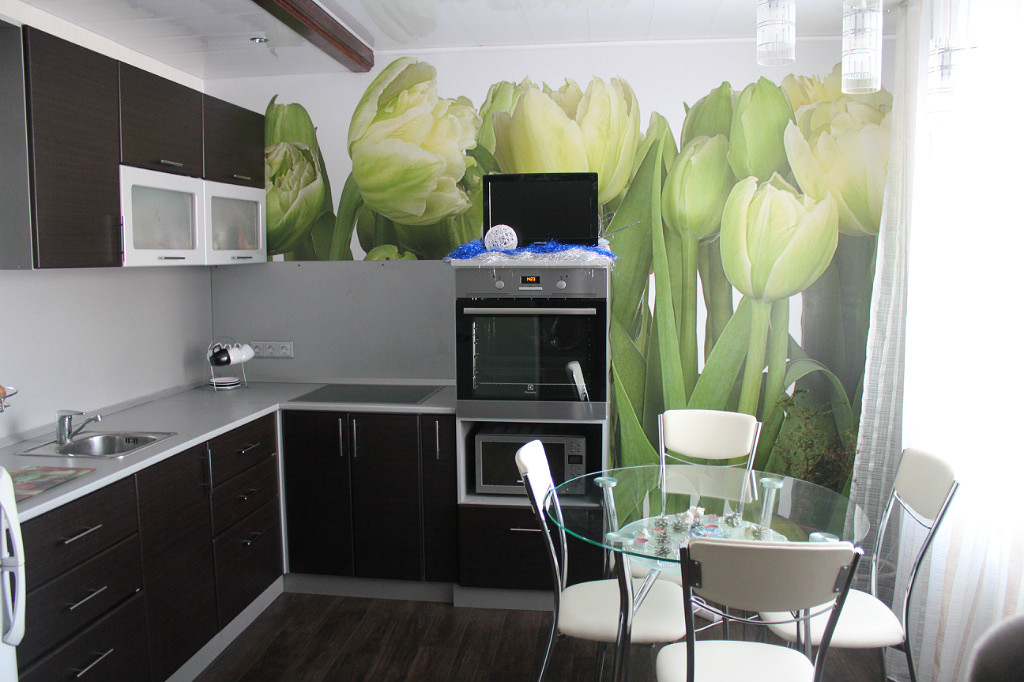 Дизайн кухни с фотообоями на стене может значительно выиграть, если найти правильное место для их расположения. Ведь даже маленькое помещение имеет разделение на зоны. А хороший рисунок способен выгодно их подчеркнуть.