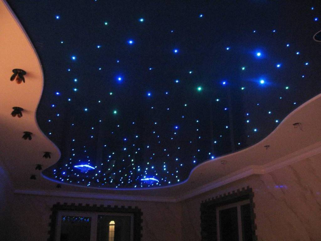 «Звездное небо» интересно смотрится ночью. При монтаже данных конструкций используют поливинилхлоридную пленку. Оригинальный эффект достигается благодаря применению многочисленных источников света – оптоволоконных нитей. Они имеют диаметр около 0,3 мм. Соединяя их в пучки, удается получить различную насыщенность.