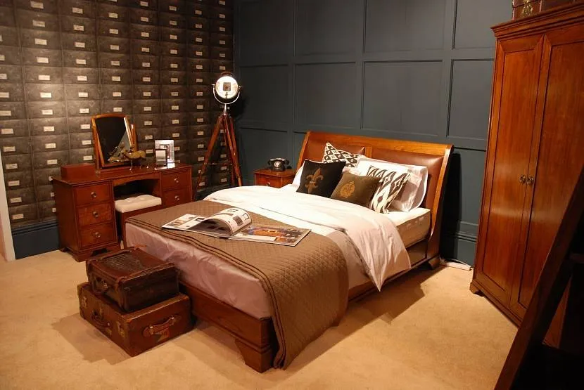 Меблировка – тяжелая, добротная, с минимальной отделкой, нарочито потертая, изобилующая металлическими деталями.