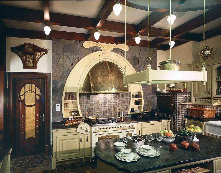 Шикарное оформление ретро кухни в стиле ар нуро хорошо подойдет для просторного помещения с высоким потолком.