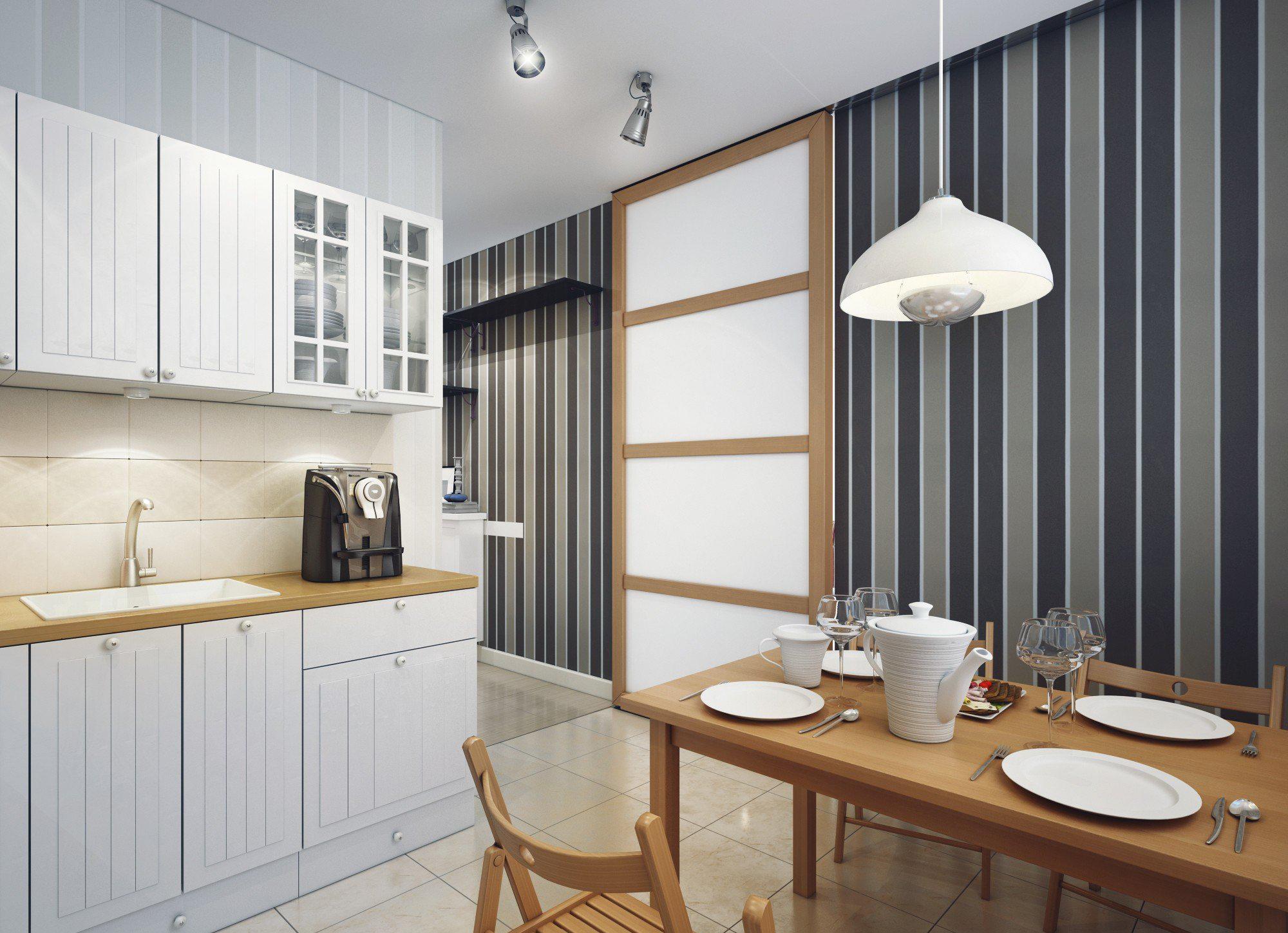 Варианты комбинирования цветов и рисунков обоев в кухню небольшого размера
