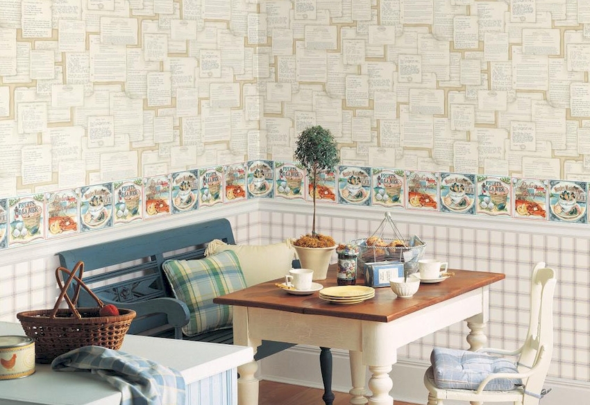 Если возникло желание применить на кухне комбинацию из обоев, советуют приобретать материалы из одной коллекций. К обоям-партнерам, например, варианту однотонному и с рисунком, можно подобрать и различные бордюры. Удобство здесь заключается в одинаковой толщине и плотности полотен. Пример, как правильно подобрать обои двух цветов на кухню, можно увидеть на фото;