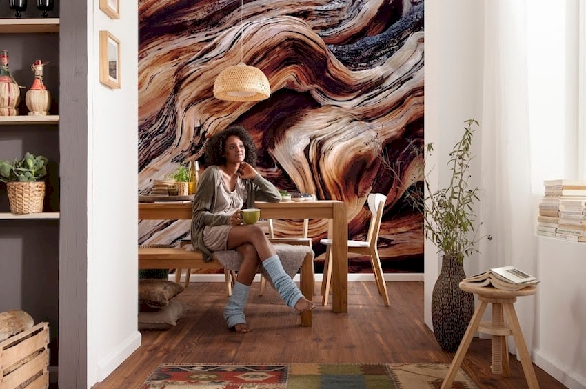 Хороший вариант – плотные полотна с имитацией древесины или грубого, необработанного камня природных оттенков. Также допускается оклейка стен материалом с изображением деревьев, растений.