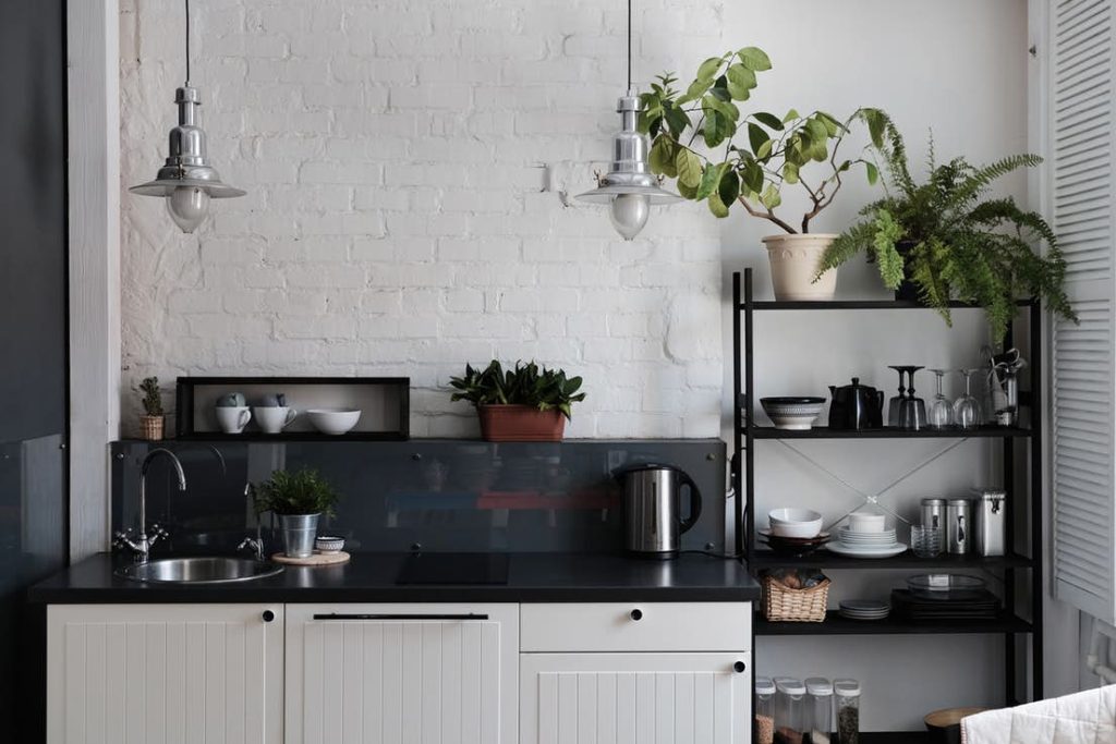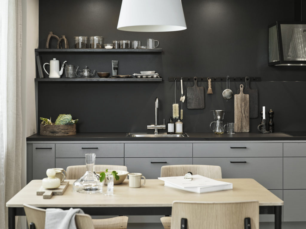 Черный – вариант для просторных кухонь. В зависимости от компаньона, может создавать разную атмосферу, от теплой, домашней, до прохладной, брутальной. Может визуально корректировать пространство, скрывать неровности стен или неудачную архитектуру. Добавляет насыщенности компаньонам, смотрится элегантно и стильно. Минусы: на нем видны все пятна от продуктов, воды и мыльной пены. Если с черным переборщить, получится мрачная, гнетущая атмосфера.
