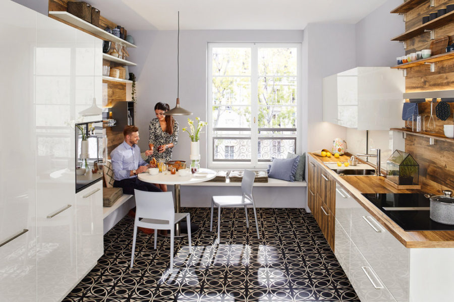 Выбор в пользу белой столешницы и соответствующей задней панели также поможет увеличить кухню. Еще один способ включить цвет в вашу кухню-это выбрать шкафы со стеклянными дверцами, где вы можете легко отображать забавные безделушки или индивидуальные тарелки. Оживить кухню также легко, благодаря ярким оформленным окнам, красочно раскрашенному острову и наклонному потолочному окну. Белые шкафы и деревянные столешницы позволяют занять центральное место. А белый и серый контраст открывает планировку кухни и предлагает элегантный внешний вид. Если вы выберете более светлые цвета на стенах и кухонном гарнитуре, рассмотрите возможность сопряжения его с более темными полами, чтобы усилить контраст.