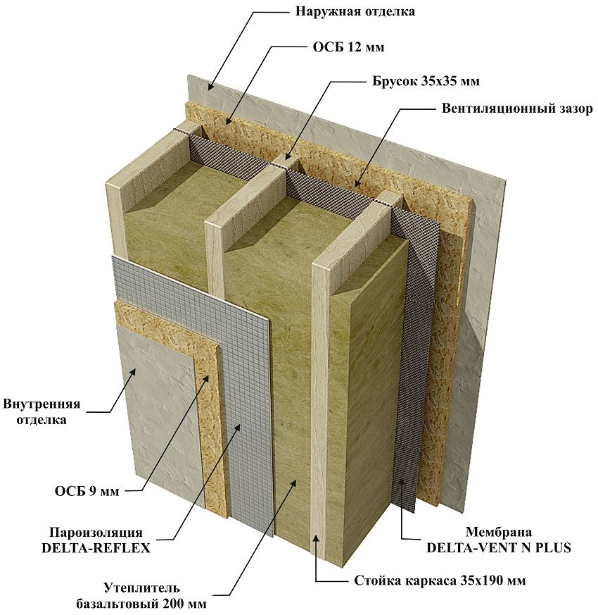 - Защитные материалы всегда крепятся к внешней стороне каркаса, вплотную к утеплителю.