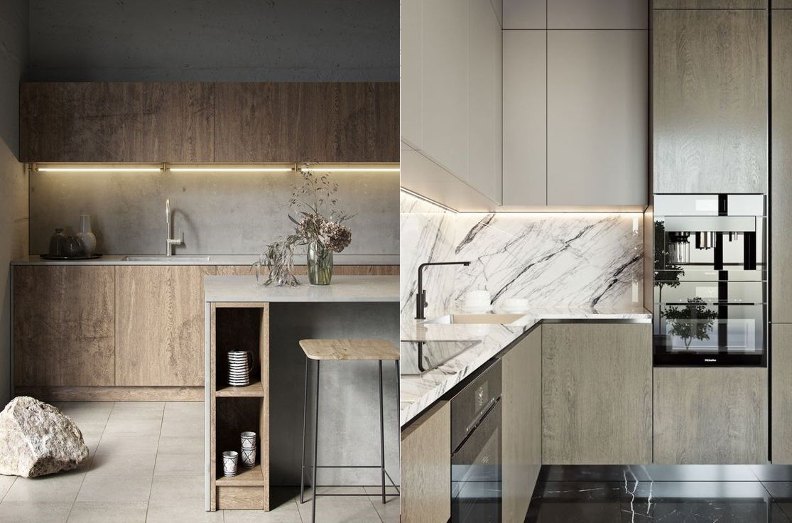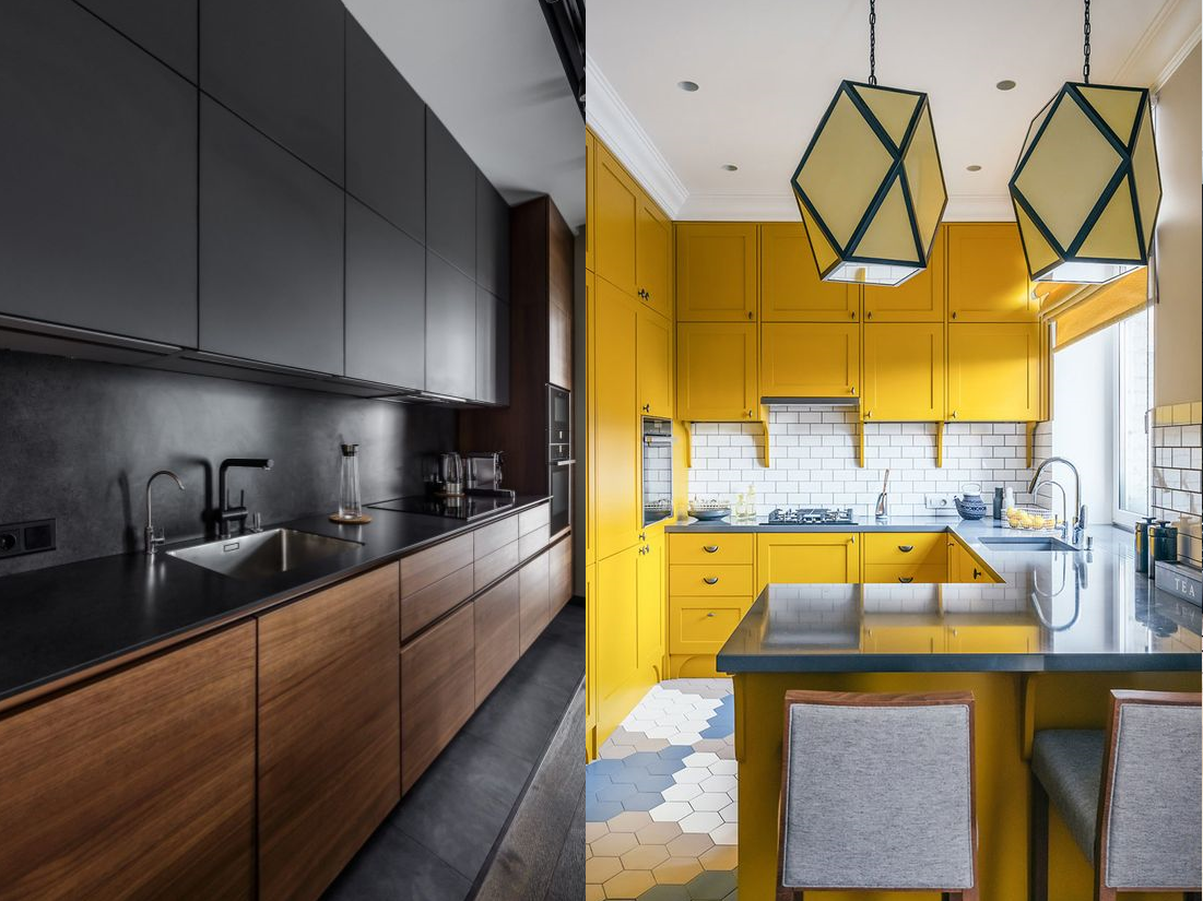 У кухонного гарнитура есть несколько поверхностей: дверцы шкафов (фасады), мебельный каркас, полки и столешница. Разберём для общего развития какие они бывают, хотя на самом деле есть всего 1 верный вариант и его мы явно укажем. На фото будут в основном кухни больших размеров, потому что они клёвые. Если у вас маленькая, куча реальных фоток и особенностей есть тут: Кухонный гарнитур для маленькой кухни.