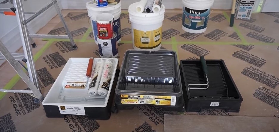 Для работы потребуется малярная ванночка, лопатка для перемешивания краски и малярный скотч. Чтобы не испачкать полы или мебель, их укрывают пленкой.