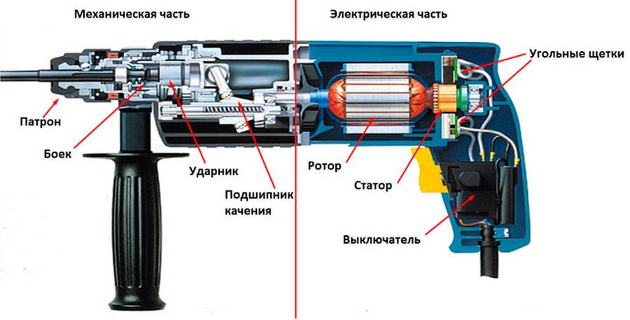 В отличие от дрели перфоратор имеет специальный пневматический поршень, который приводится в действие от электродвигателя и наносит удары по тыльной стороне рабочей насадки.