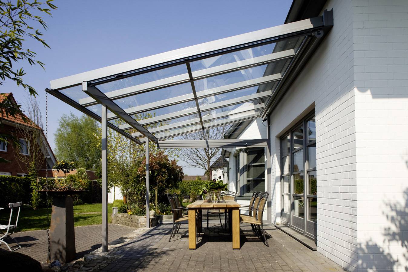 Навес из монолитного поликарбоната имеет вид стеклянного покрытия