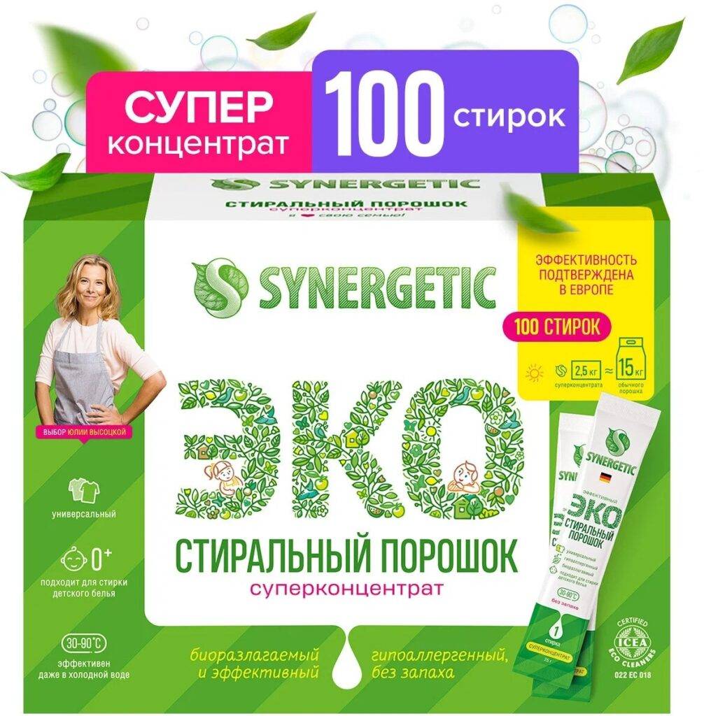 Этот уникальный суперконцентрат занимает в 6 раз меньше пространства, чем привычное средство. Только 25 граммов этого чудо-агента способны заменить 150 граммов традиционного порошка. По эффективности один стик сравним с лидерами рынка, в то время как двойная дозировка превзошла всех конкурентов в исследованиях. SYNERGETIC также далеко шагнул в плане экологичности. Благодаря отсутствию лишних добавок и передовым технологиям, производство средства требует на 90% меньше энергии и сокращает выбросы CO2. Компоненты, из которых состоит порошок, абсолютно безопасны для людей с аллергией, астмой и даже для самых маленьких детей.