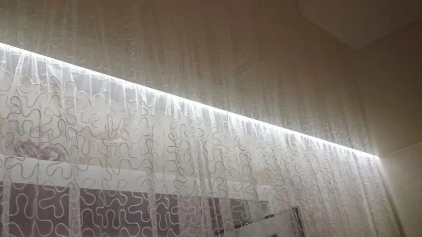 - Струнная конструкция. Имеет свои минусы – под тяжелыми шторами может провисать, и тогда ее не спрятать. Натягивается между креплениями, установленными на противоположных концах потолка. Не может формировать изгибы или закругления. Этот вариант – самый экономичный из всех.