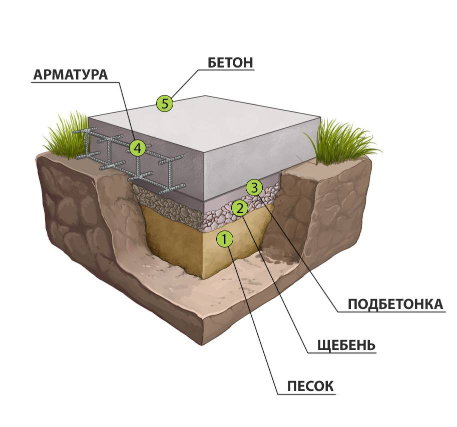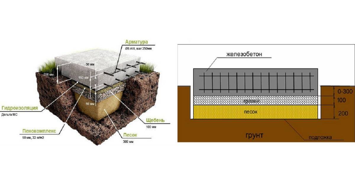 Песчаная подушка располагается выше грунта и ниже бетонного фундамента, укреплённого арматурой