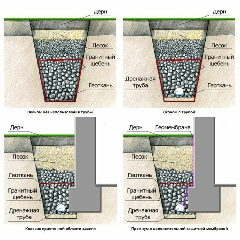 Такой вариант подушки рекомендован к устройству на глинистой почве. Она не пропускает влагу, защищает от грунтовых вод, но не отменяет необходимость обустройства гидроизоляции.