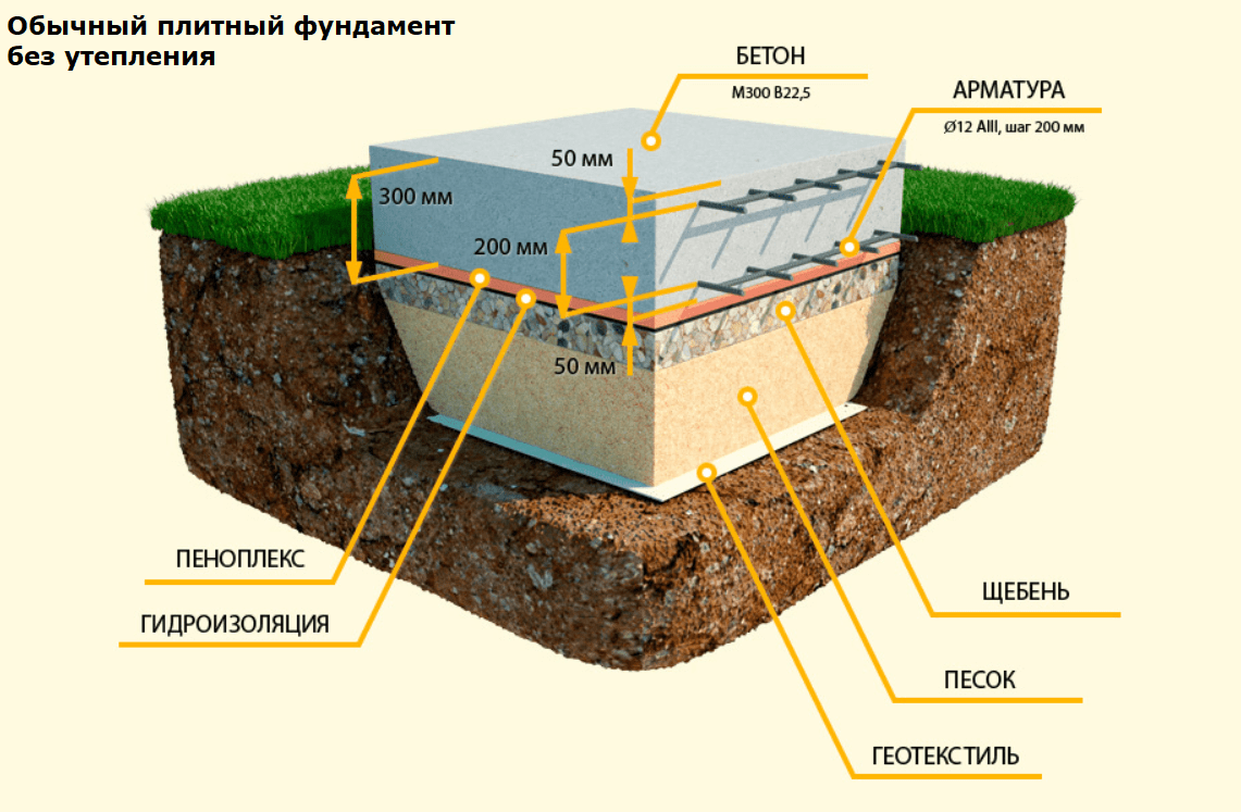 - Мелкозаглубляемую плиту обычно заливают заподлицо с поверхностью грунта. Глубина котлована складывается из суммарной толщины всех слоёв — в том числе: песчано-щебёночного подстилающего слоя, который занимает основную часть объёма котлована; подбетонки; гидроизоляционных прослоек.