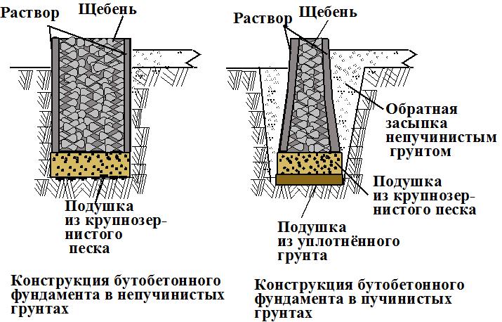 - котлован или траншея по дну прокладываются бутом, диаметр которого не должен превышать пятнадцати сантиметров. Если глубина котлована позволяет, и вы предполагаете, что нагрузка от объекта будет существенной, бут разрешается уложить в два слоя;