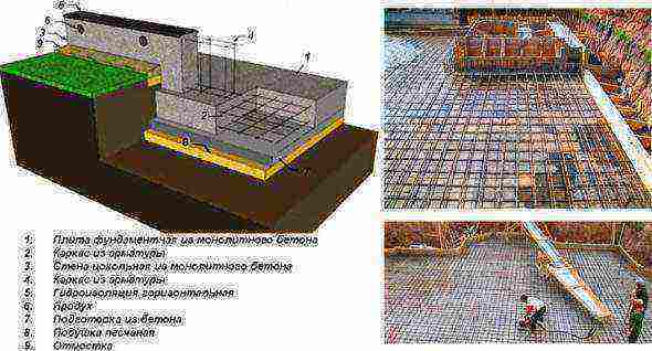 Такой вариант монолитной основы является наиболее прочным. К сожалению, из-за высокой стоимости материалов и работ, заливка бетонной подушки фундамента применяется редко.