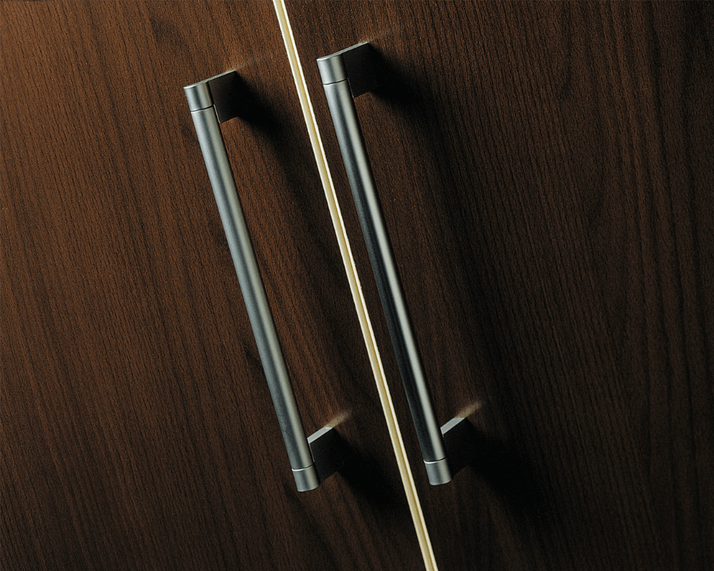 - Накладная фурнитура в закрытом состоянии плотно прижата к торцевой части. Створки в таком состоянии полностью скрывают корпус мебели.