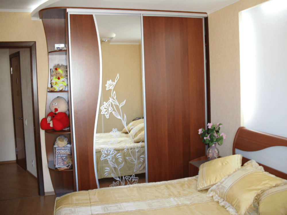 В спальне его можно встроить или сбоку от кровати, или напротив нее. При установке напротив большое значение имеет передняя поверхность – она должна подойти по вкусу хозяевам. В этом случае для отделки фасадов стоит выбирать зеркала или простые оттенки. Аргумент в пользу шкафа с радвижными фасадами – полное прилегание к задней стене, т.е. гарантия того, что позволяет избежать скопления пыли в труднодоступных местах.