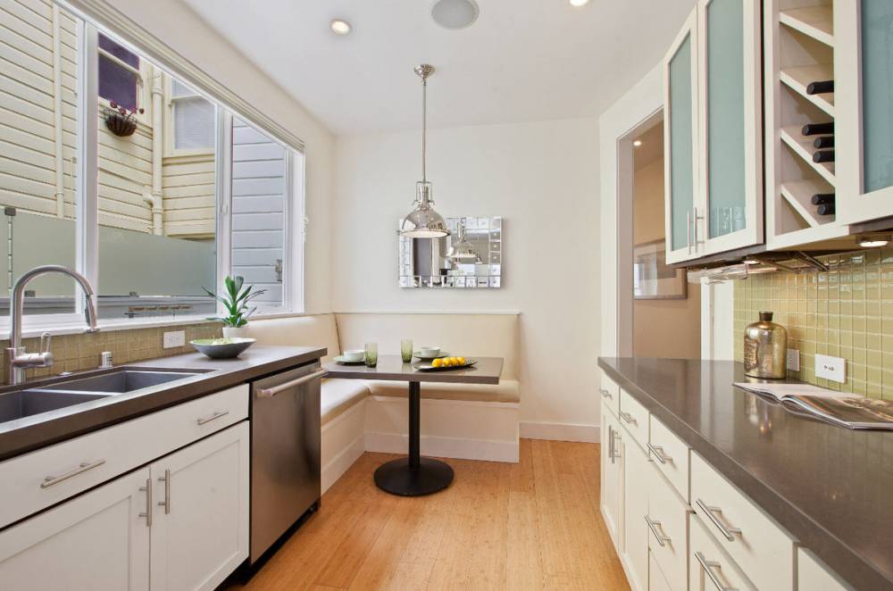 При угловой планировке, которая подойдет для квадратной кухни любых размеров, обеденный гарнитур располагается напротив угла. От него же расходятся по смежным стенам зоны хранения и готовки.