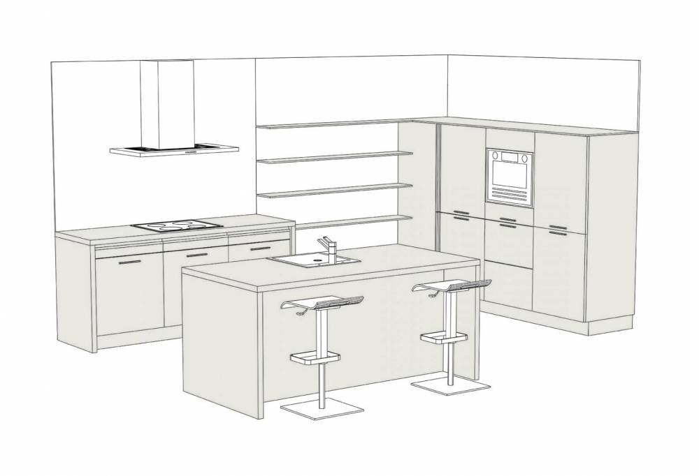 Он представляет собой совмещение П- или Г-образной планировок с небольшим «островом» из рабочей зоны или обеденной. Чаще всего это небольшой столик или тумба округлой формы, или даже плита.