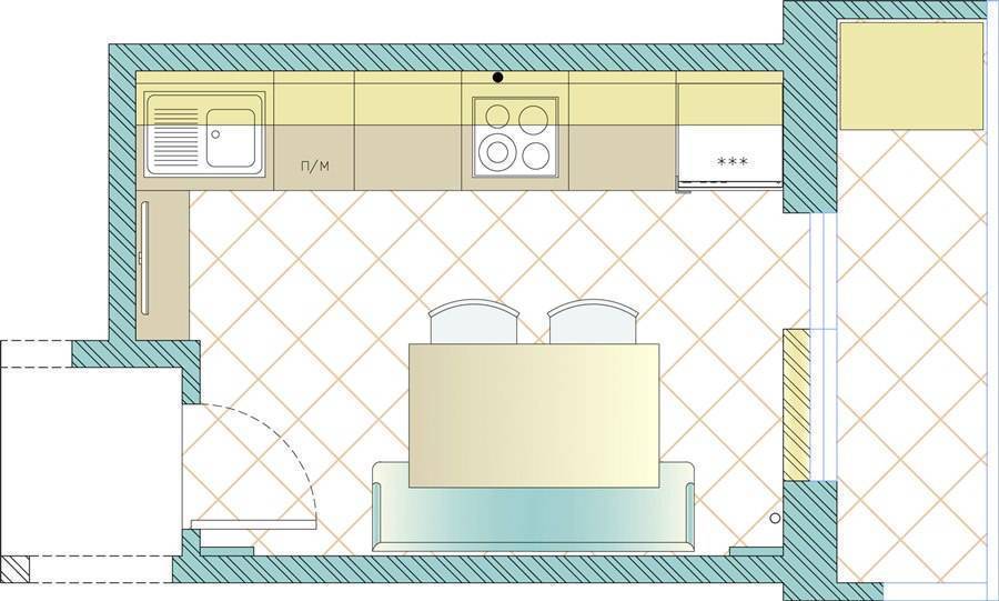 мойка устанавливается между плитой и холодильником таким образом, чтобы до первой расстояние было чуть меньше, чем до последнего; столовая размещена у свободной стены, не входящей в схему П; особое внимание стоит уделить тому, чтобы было удобно открывать входную дверь; длина задней стенки варьируется от 2,5 до 4 м. Такая кухня станет удобным местом для кулинара-любителя, так как готовить на ней комфортно и приятно. Такая кухня станет удобным местом для кулинара-любителя, так как готовить на ней комфортно и приятно