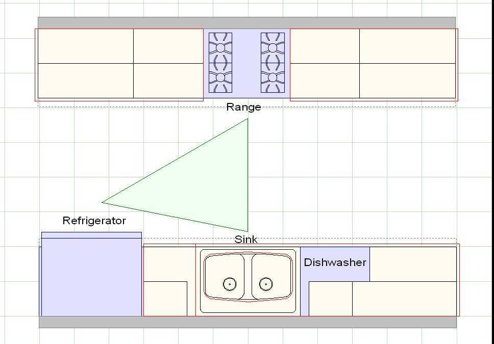 - холодильник ставят у одного ряда, плита и раковина — у другой стены;