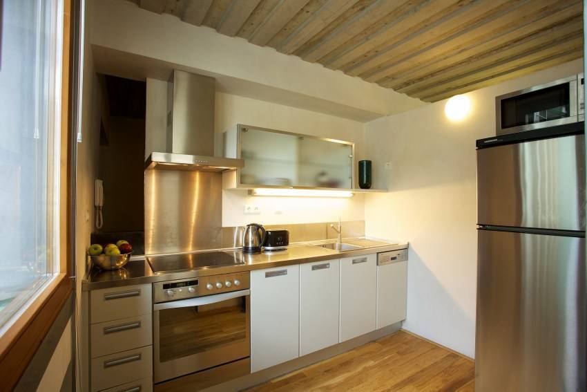 Для оптимального использования вытянутых в длину комнат подойдет линейное расположение: кухонная стенка с необходимой техникой и обеденная зона располагаются вдоль длинных стен.