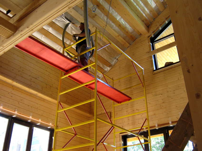 - Слой теплоизоляции прокладывается между стропилами и каркасом.