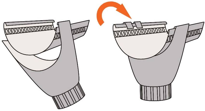 Соединение желобов осуществляется с помощью стыковочных замков. При соединении водосточных желобов, между торцами соединяемых частей необходимо оставить зазор 2-3 мм. для компенсации температурных расширений. Для лучшей герметизации соединения на резиновую прокладку рекомендуется наносить битумный герметик по краям и в центре прокладки. Задняя часть замка крепится к внутренним сторонам желобов. Далее замок прижимается в сторону внешней стороны, чтобы обеспечить плотное прилегание прокладки к желобам. Защелкивают замок и фиксируют его путем загибания прижимных клемм. Остатки герметика необходимо удалить.