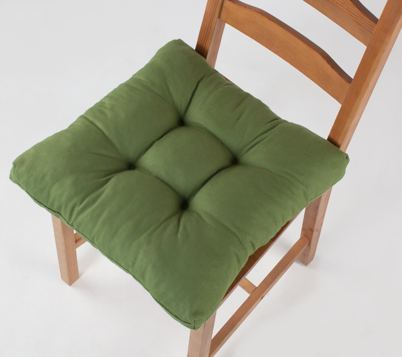 Изделие имеет квадратную форму (40х40 см) и крепление — завязки. Высота от поверхности стула – 10 см. Материал чехла – хлопок, наполнитель – холлофайбер.
