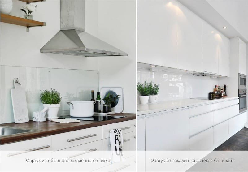 Оптивайт (Optiwhite) – отбеленное закаленное стекло, не имеющее характерного «бутылочного» зеленовато-голубого оттенка, а потому больше подходящее для фартуков со светлой декоративной подложкой и в том случае, если вам важна чистота цвета и детальность рисунка. Однако фартук для кухни из стекла Оптивайт стоит дороже неотбеленного примерно в полтора-два раза. На фото ниже вы можете увидеть разницу между стеклом Оптивайт и неотбеленным стеклом.